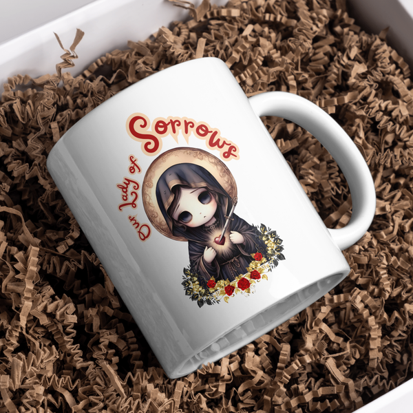 Dù được thể hiện qua phong cách chibi, Đức Mẹ Sầu Bi vẫn giữ được sự trang nghiêm và lòng cảm thương. Đôi mắt buồn bã và nụ cười hiền dịu của Đức Mẹ chibi là lời nhắc nhở về nỗi đau mà Mẹ đã trải qua khi chứng kiến Chúa Giêsu chịu khổ nạn. Chiếc ly sứ in hình Đức Mẹ Sầu Bi chibi là một biểu tượng mạnh mẽ của sự đồng cảm và chia sẻ, giúp người sử dụng cảm nhận được sự an ủi trong những lúc khó khăn.