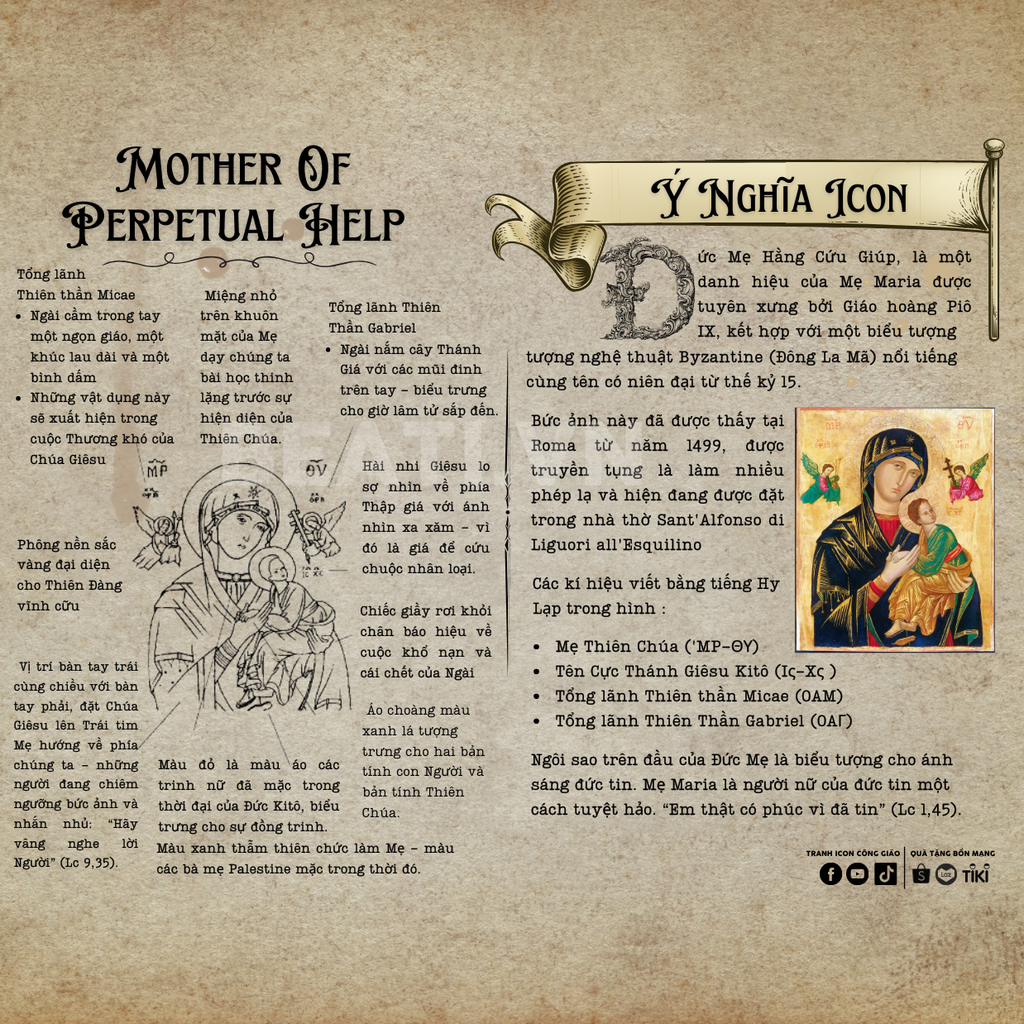 Dưới đây bức Icon Đức Mẹ Hằng Cứu Giúp nguyên thủy. Hiện nay, có rất nhiều " dị bản" với những hình ảnh phục chế khác nhau hiện đại hơn, đường nét sắc sảo hơn nhưng chỉ có tác phẩm nguyên bản luôn lột tả hết những yếu tôn giáo và đa tầng ý nghĩa.