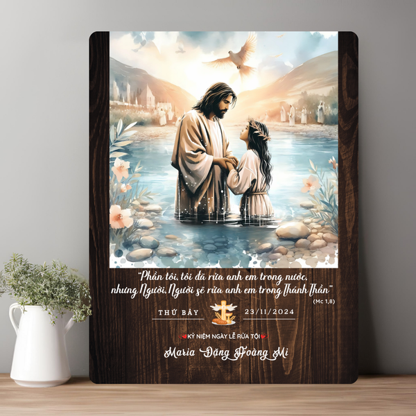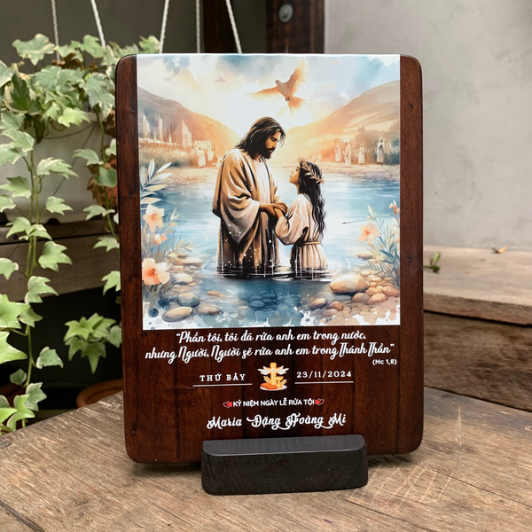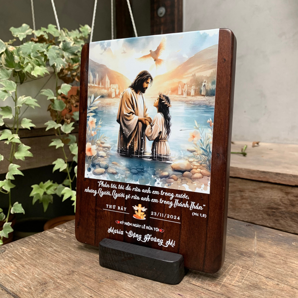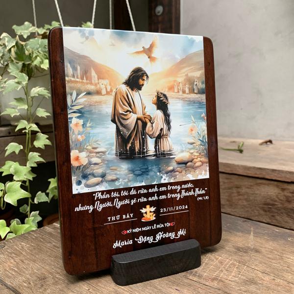 ✅ Khắc tên bé, ngày Rửa Tội và câu Kinh Thánh lên tranh hoặc quà tặng.