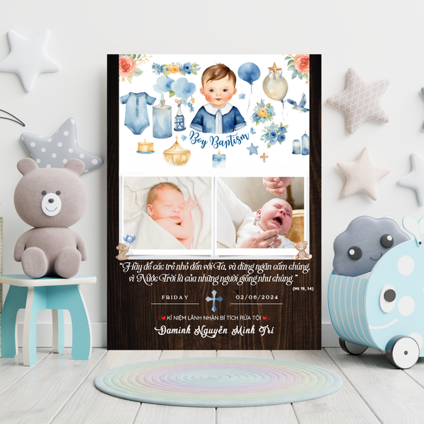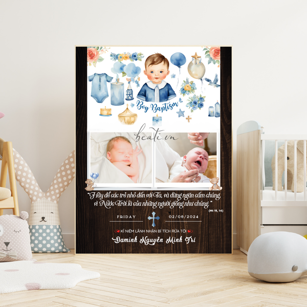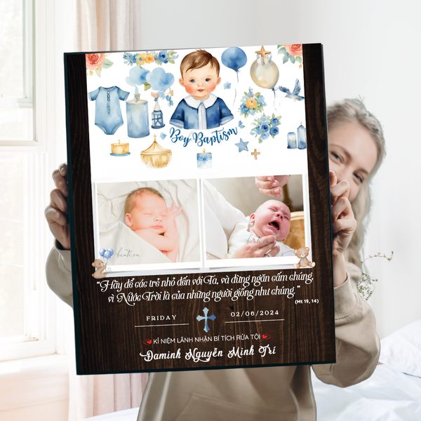 Tranh gỗ UV-printed là một lựa chọn tuyệt vời cho ngày lễ rửa tội. Với chất liệu gỗ tự nhiên và kỹ thuật in UV hiện đại, tranh gỗ mang đến sự bền vững và vẻ đẹp tinh tế. Bạn có thể lựa chọn các thiết kế phù hợp như hình ảnh các thánh, thiên thần, hoặc ghi tên và ngày lễ rửa tội của bé. Mỗi bức tranh không chỉ là món quà vật chất mà còn là biểu tượng của lời chúc phúc và sự bảo vệ. Đây là món quà tinh thần đầy yêu thương và ý nghĩa sẽ trả lời cho câu hỏi lễ rửa tội nên tặng gì cho bé trai và món quà tặng bé gái.