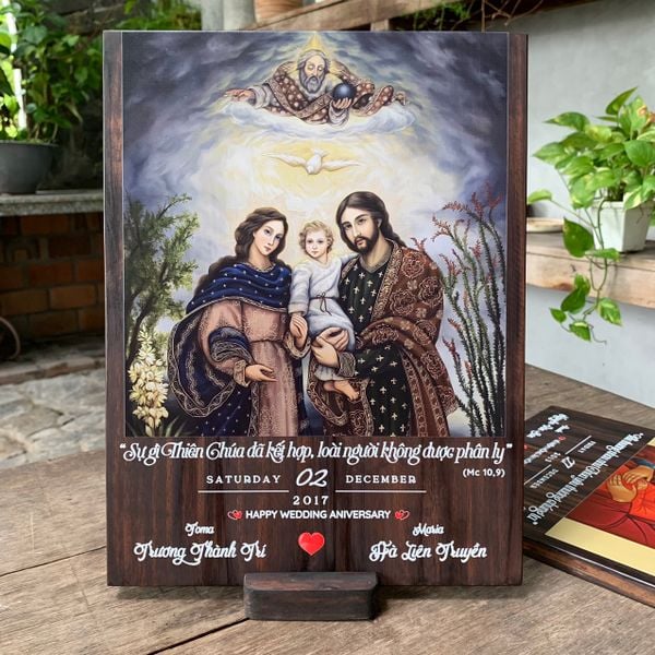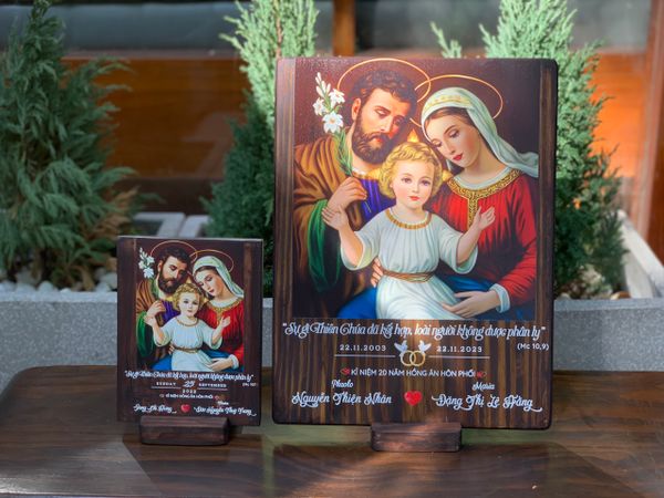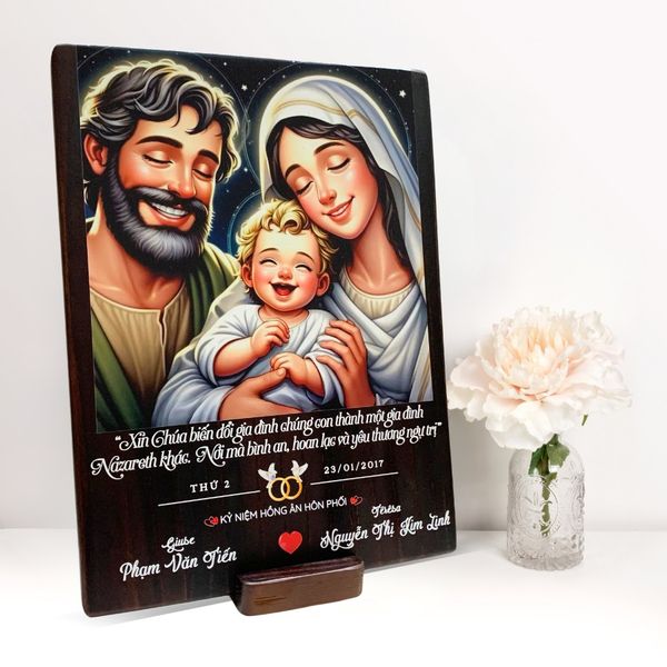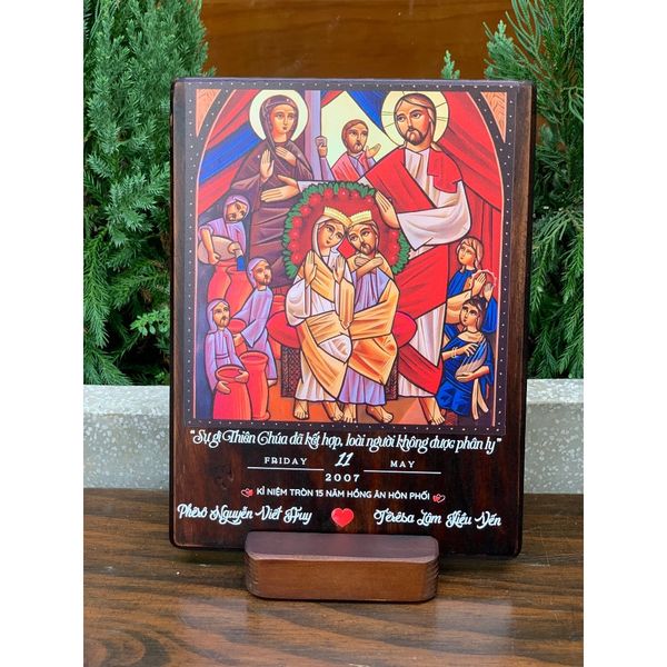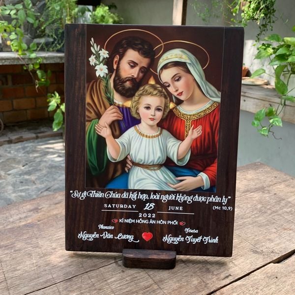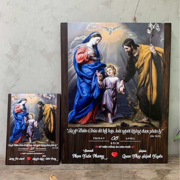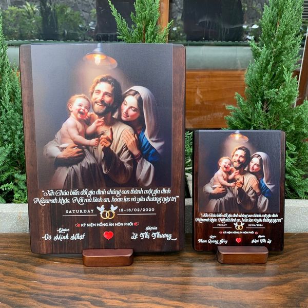 Tranh gỗ Công Giáo kỷ niệm hôn phối khắc tên không chỉ là món quà tuyệt vời cho các cặp đôi trong ngày kỷ niệm mà còn là một tác phẩm nghệ thuật mang lại sự ấm áp và bình an cho gia đình. Hãy liên hệ với Beati ngay để chọn lựa món quà đặc biệt này cho người thân yêu của bạn nhé!