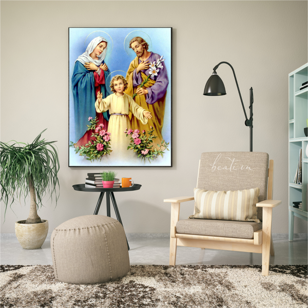 Hình ảnh Gia đình Thánh Gia được tôn vinh trong nghệ thuật Công Giáo từ thời kỳ đầu, thể hiện sự gắn bó và yêu thương trong một gia đình thánh thiện. Đức Mẹ Maria là biểu tượng của sự khiêm nhường và sự hy sinh vô điều kiện cho con cái, Thánh Giuse là hiện thân của người cha mẫu mực, chăm chỉ và bảo vệ gia đình, còn Chúa Giêsu là con chiên ngoan hiền, mang sứ mệnh cứu rỗi nhân loại. Hình ảnh này không chỉ mang tính tôn giáo mà còn là bài học về giá trị gia đình, tình yêu và sự chăm sóc lẫn nhau.