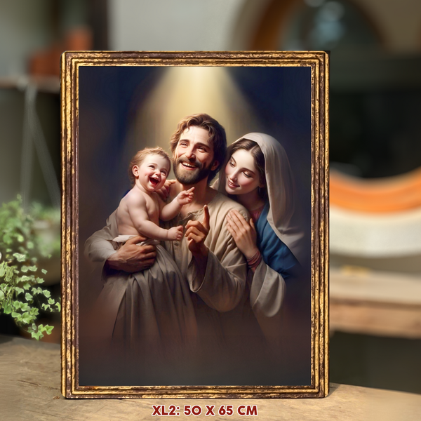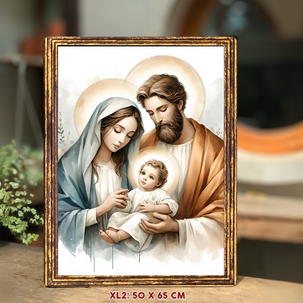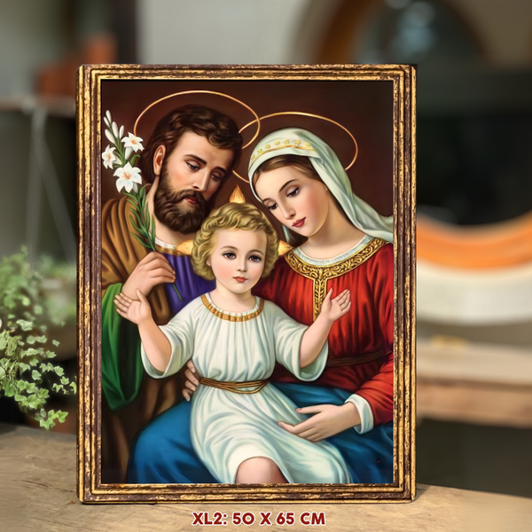 Bức tranh diễn tả tình yêu, sự hiền hòa và lòng trung tín của Thánh Gia – mẫu gương tuyệt vời cho mọi gia đình Kitô hữu. Khi dâng tặng tranh Thánh Gia làm quà tân gia, bạn đang trao gửi lời cầu chúc cho một gia đình luôn sống trong sự yêu thương, thánh thiện và hiệp nhất như Thánh Gia Thất.