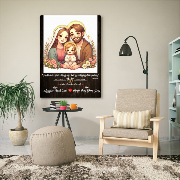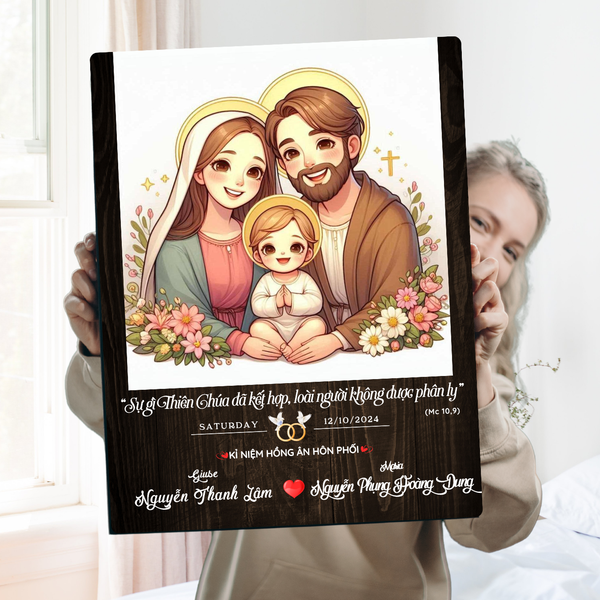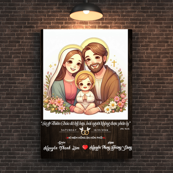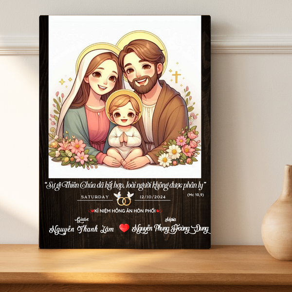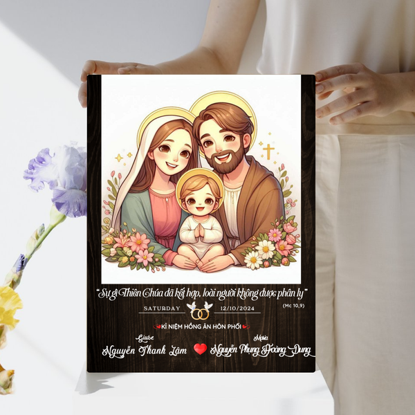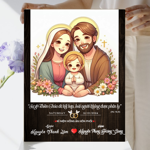 Không chỉ là một món quà vật chất, tranh gỗ mang đến giá trị tinh thần đặc biệt. Bạn có thể chọn những mẫu tranh kỷ niệm cưới in hình ảnh cặp đôi, lời chúc mừng hạnh phúc, hoặc những biểu tượng tôn giáo như hình ảnh của Chúa hoặc Đức Mẹ theo phong cách chipi , thể hiện tình cảm và sự chúc phúc chân thành.