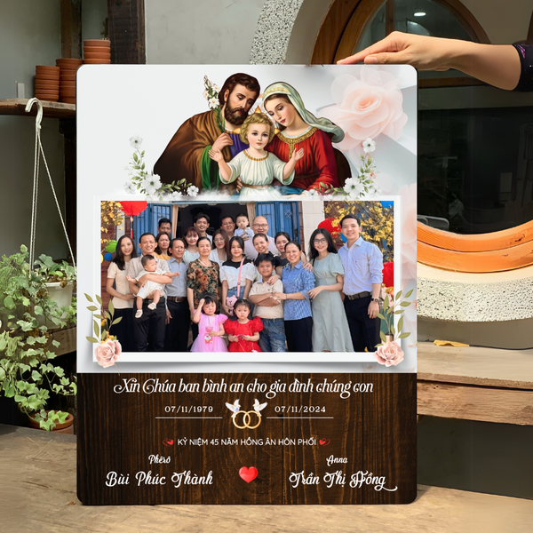 Gia đình Thánh Gia gồm Thánh Giuse, Đức Mẹ Maria, và Chúa Giês Hài Đồng là hình ảnh mẫu mực cho một gia đình thánh thiện, chan hòa yêu thương và trách nhiệm. Khi kết hợp cùng ảnh cưới hoặc ảnh gia đình, tranh trở thành món quà mang giá trị cá nhân cao, nhắc nhở những ký ức đẹp trong hôn nhân và tình cảm gia đình.