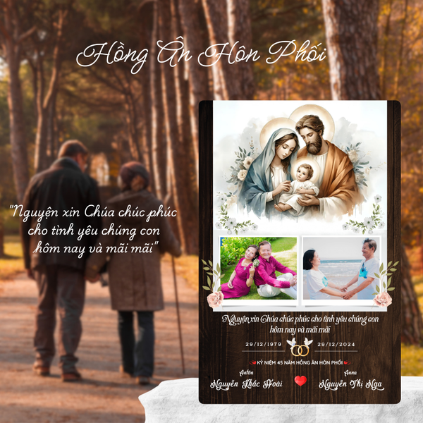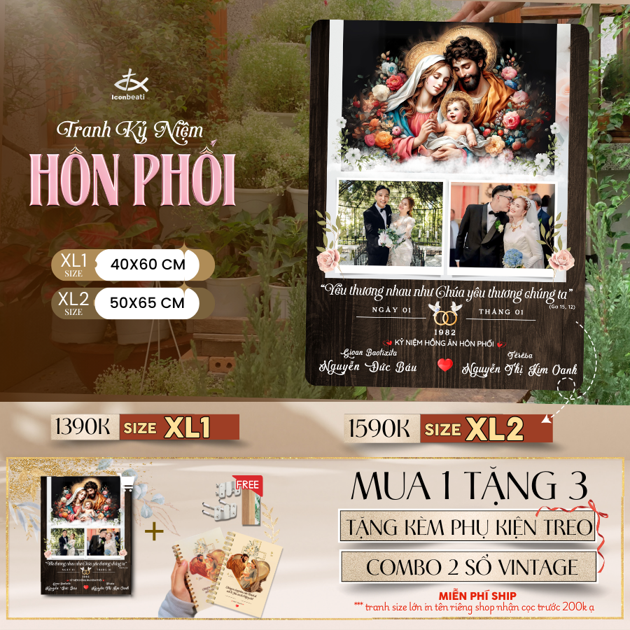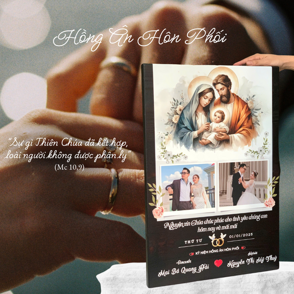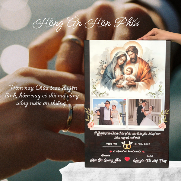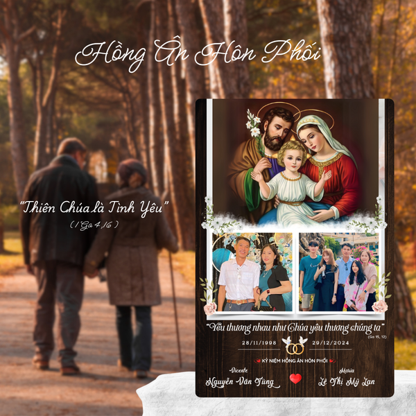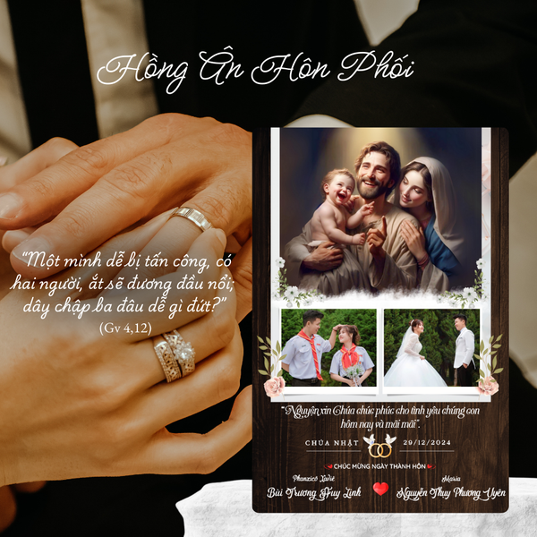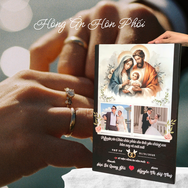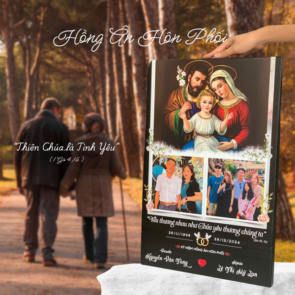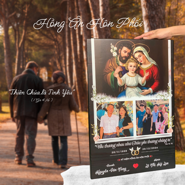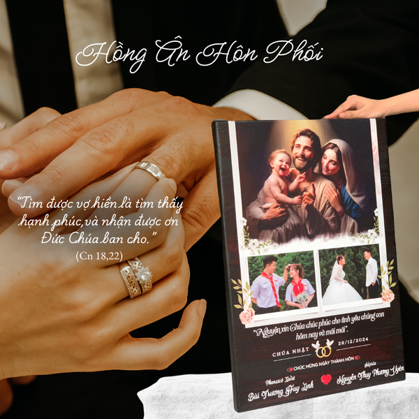 Trong hành trình hôn nhân, tình yêu và đức tin là hai yếu tố quan trọng kết nối gia đình. Tranh "Kỷ Niệm Hôn Phối" của Beati.vn được sáng tạo để tôn vinh đặc biệt ý nghĩa này. Tranh in hình Gia Đình Thánh Gia trên chất liệu gỗ đồng điệu, mộc mà, và nay còn được tùy chỉnh ghép thêm ảnh cưới hoặc ảnh gia đình đẵm chất cá nhân.