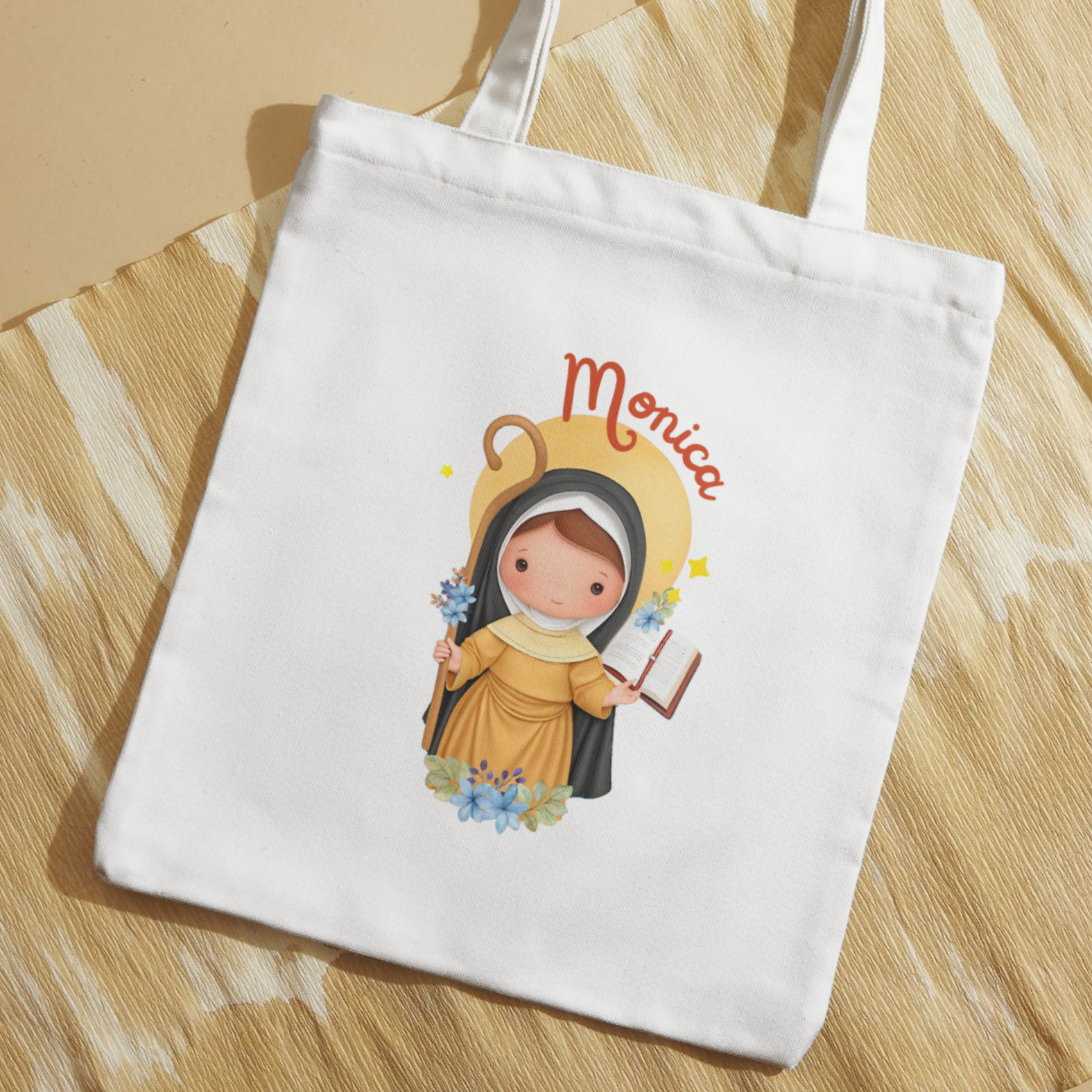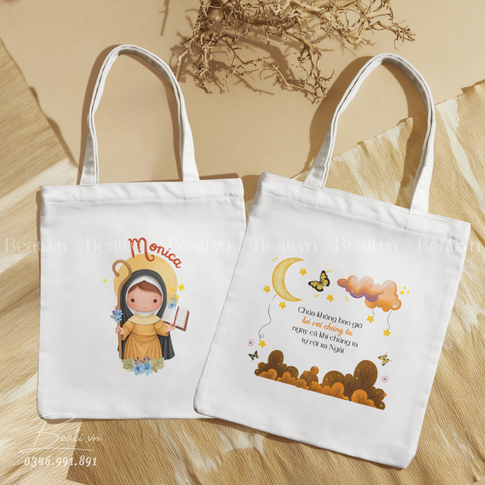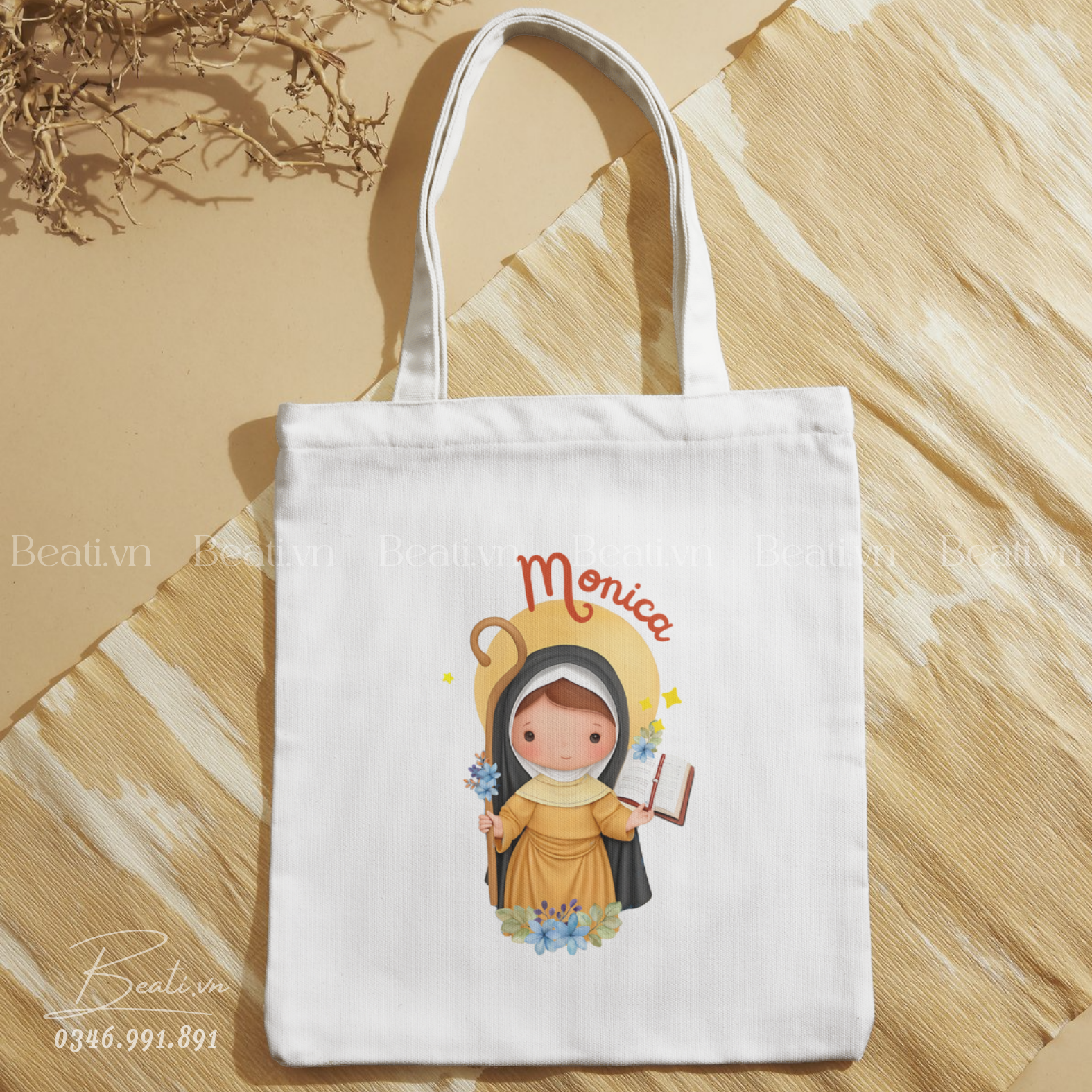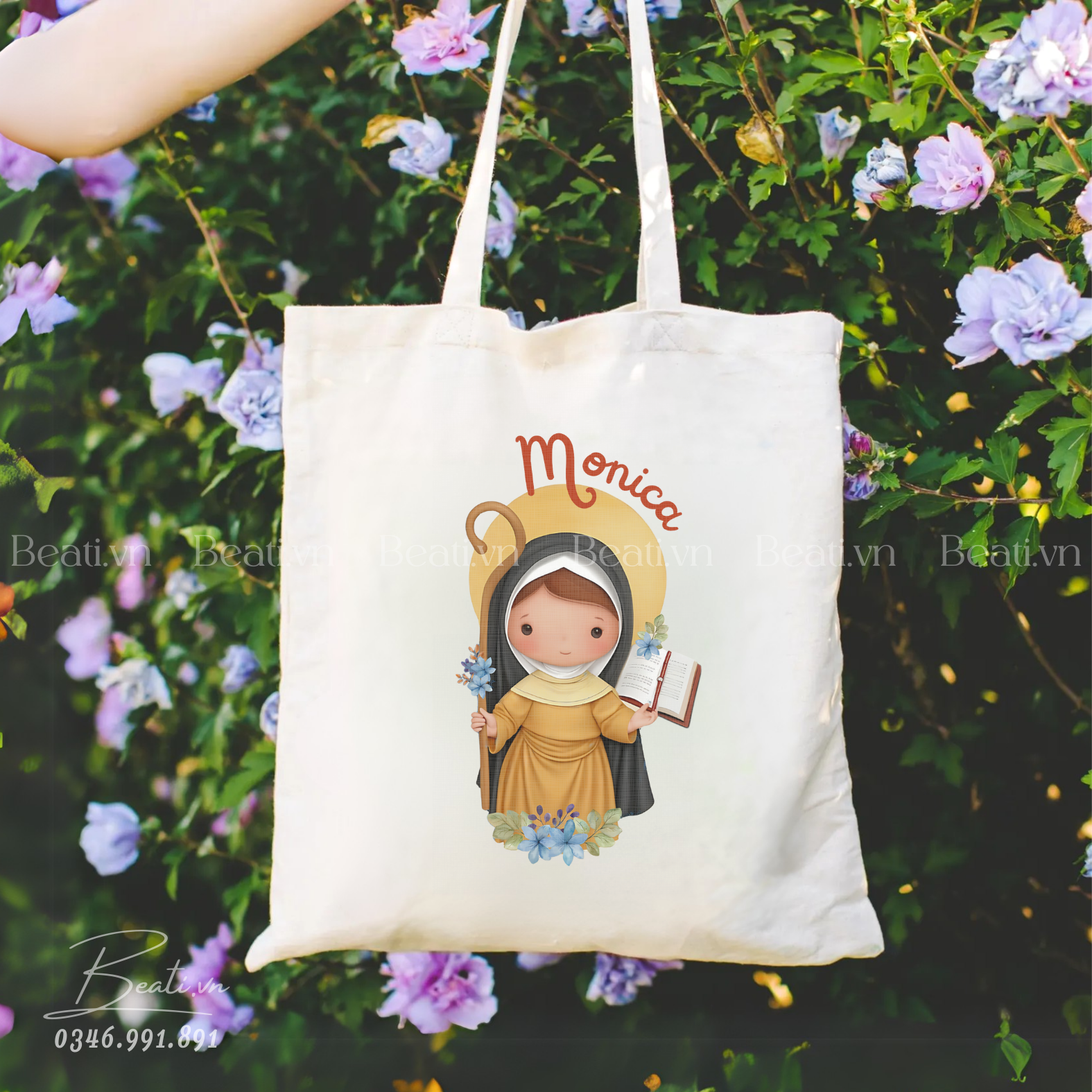 Quà lưu niệm Công Giáo, túi vải in hình Thánh Monica và câu trích dẫn theo yêu cầu
