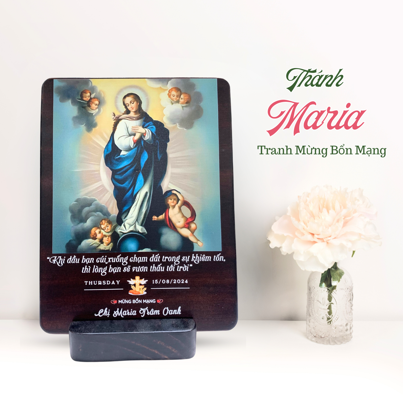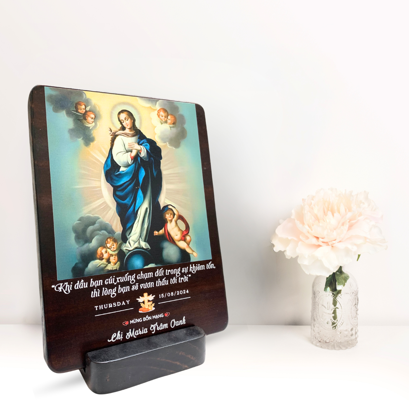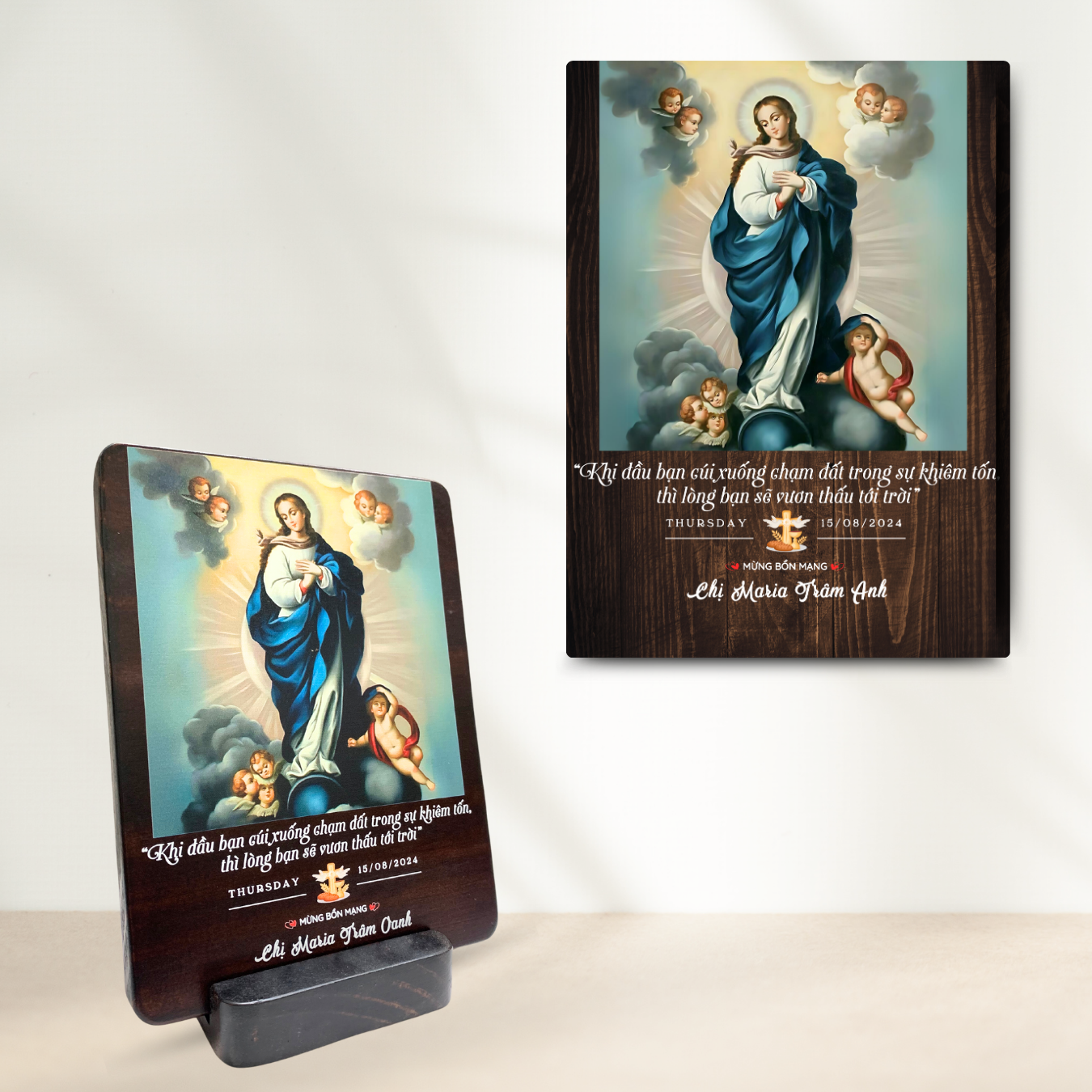 Tranh Kỷ Niệm Bổn Mạng Thánh Maria Hồn Xác Lên Trời Tranh Gỗ Công Giáo Tranh Để Bàn